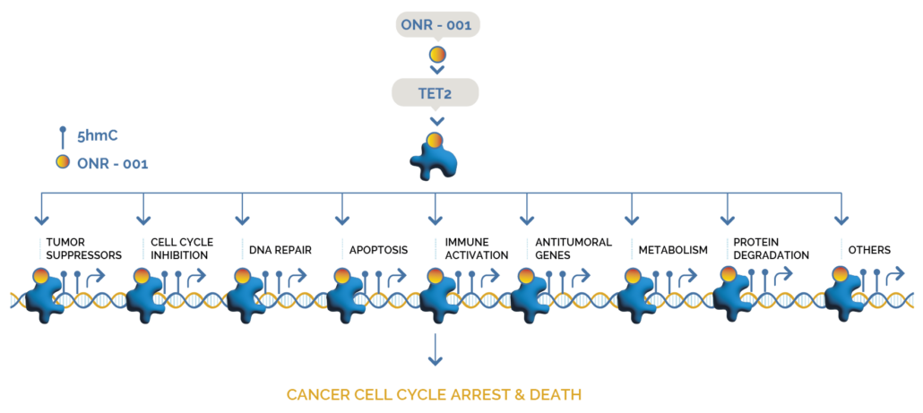 ONR-001 is a first-in-class small molecule that allosterically and specifically activates TET2, a master epigenetic enzyme, causing tumor cells to enter a cell arrest stage and even die.